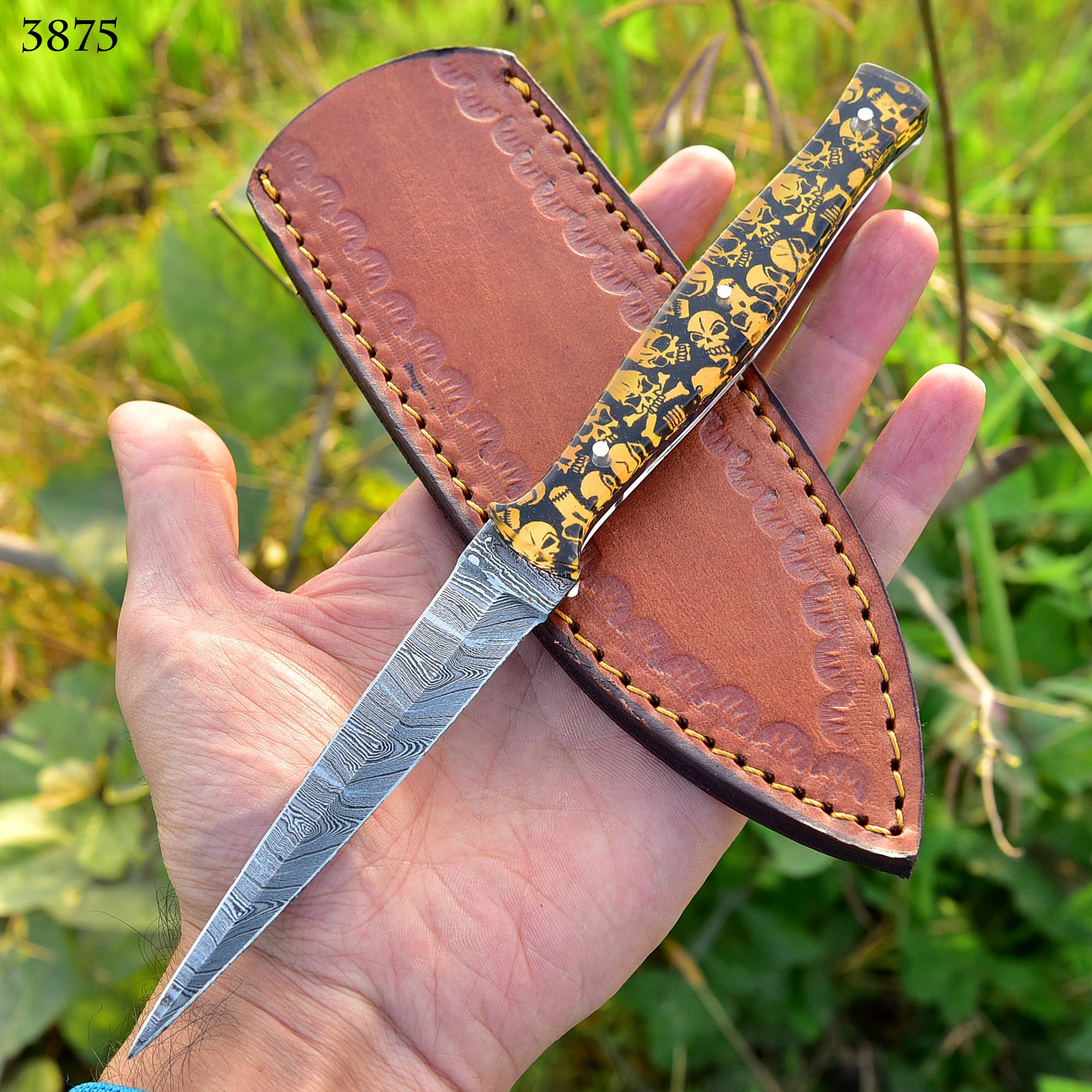 HAND FORGED DAMASCUS STEEL KNIFE Resin handle Multi purpose knife Outdoor knife Throwing knife Boot knife double edged knife Hunting camping outdoor combat WITH GENUINE LEATHER SHEATH...