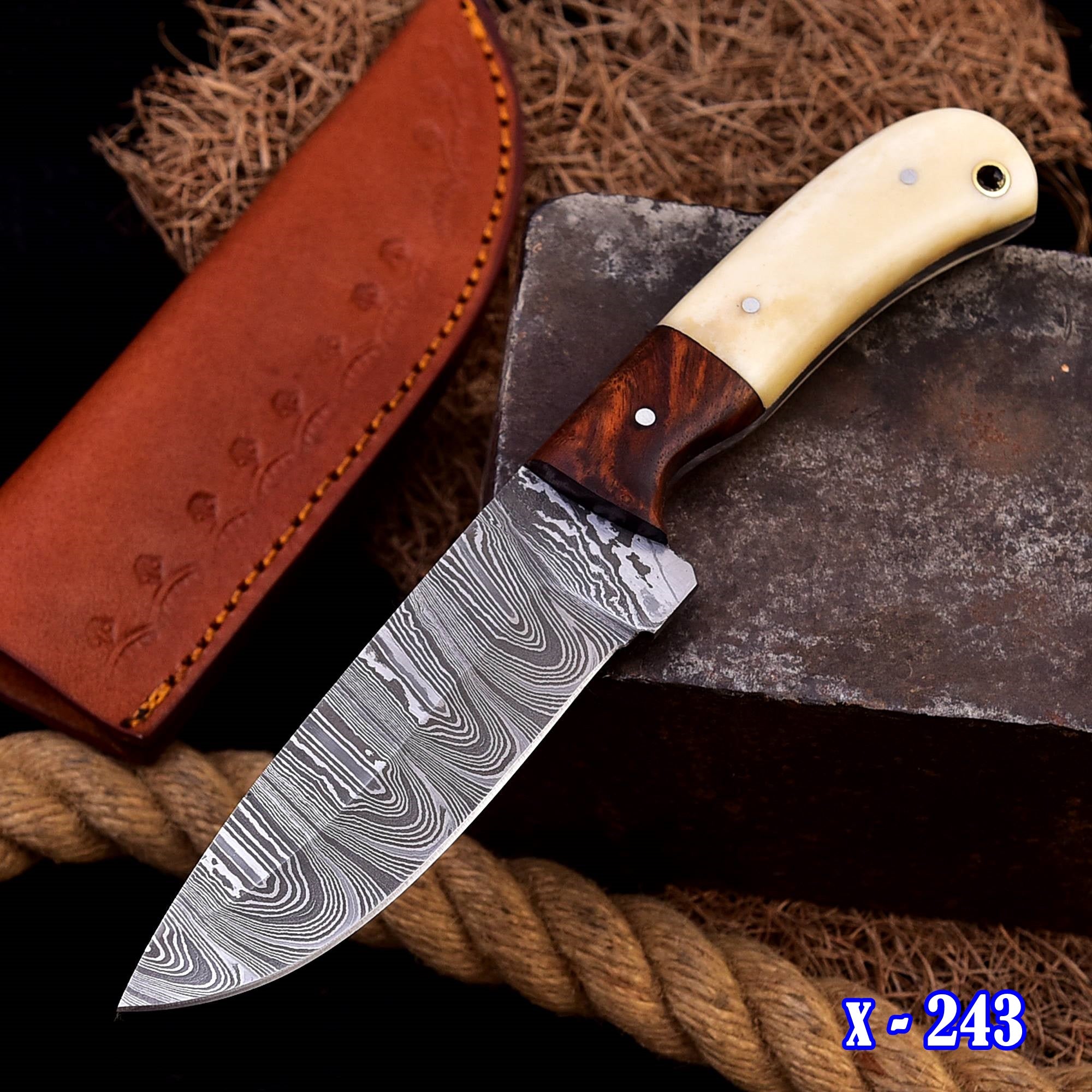 Custom made damascus hunting knife - hand forged damascus steel sharp blade x-243