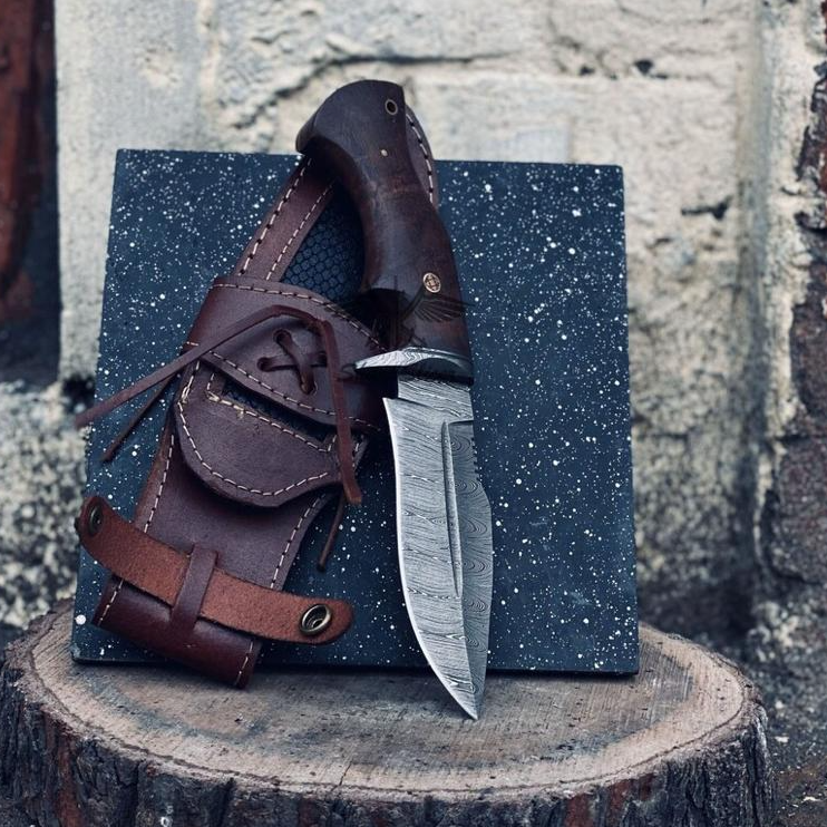 10" custom handmade damascus hunting knife with leather sheath - ideal for skinning camping outdoor edc fixed blade bushcraft knife with walnut wood
