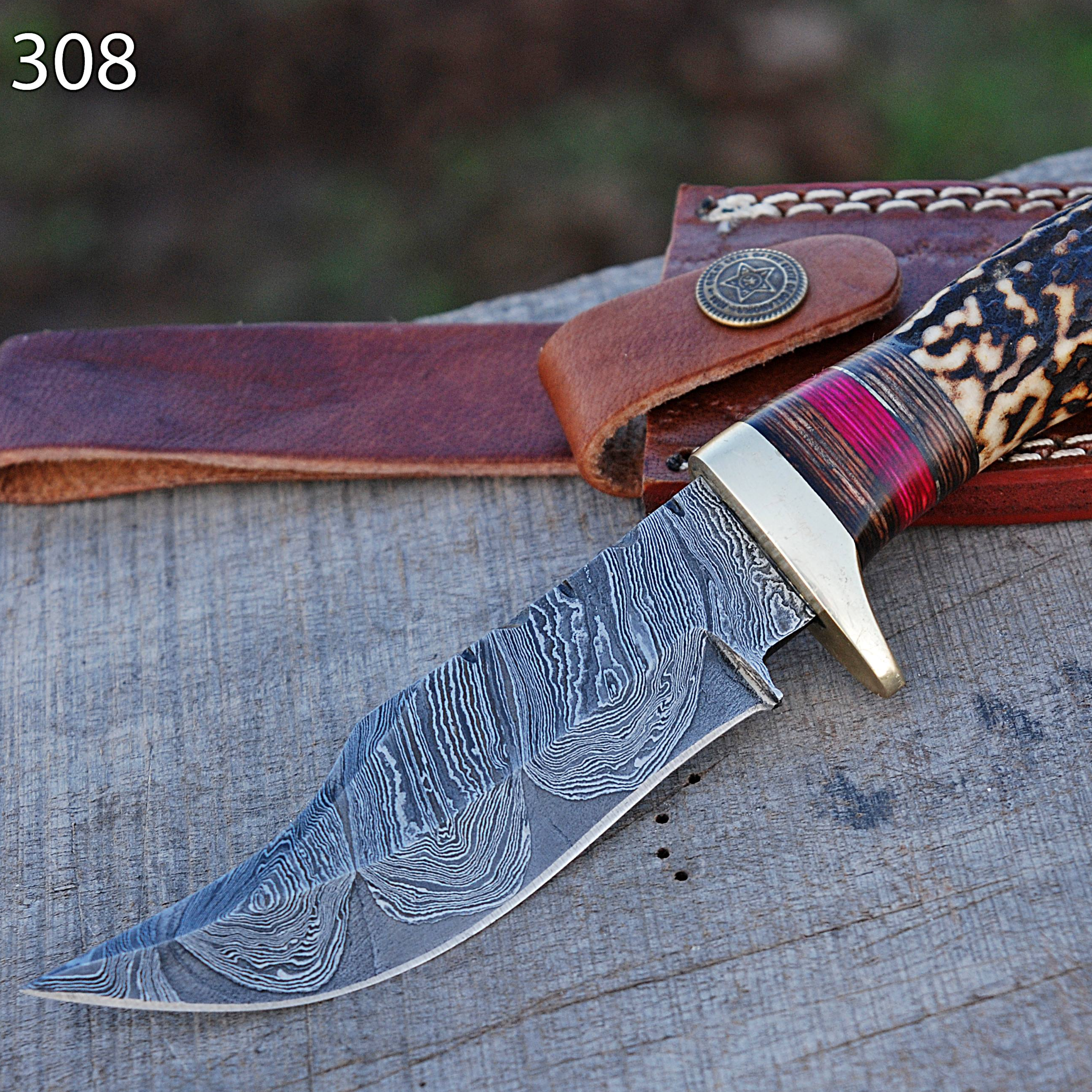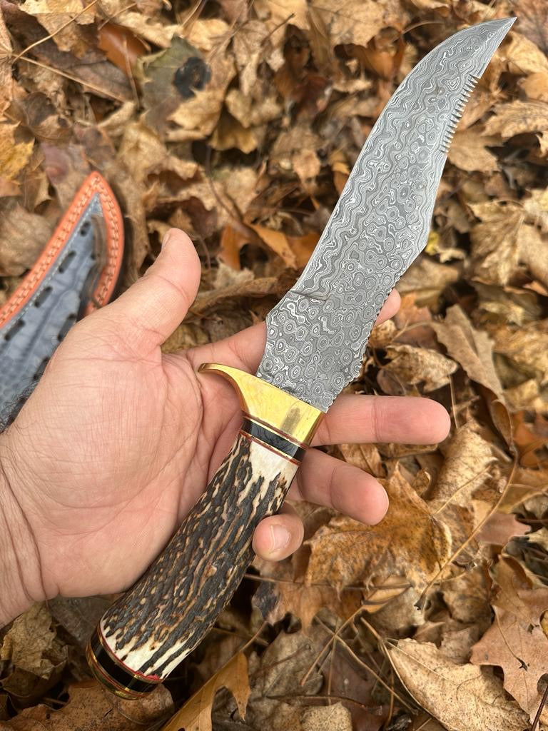 Stag antler knife forged damascus skinner knife deer stag handle with leather sheath