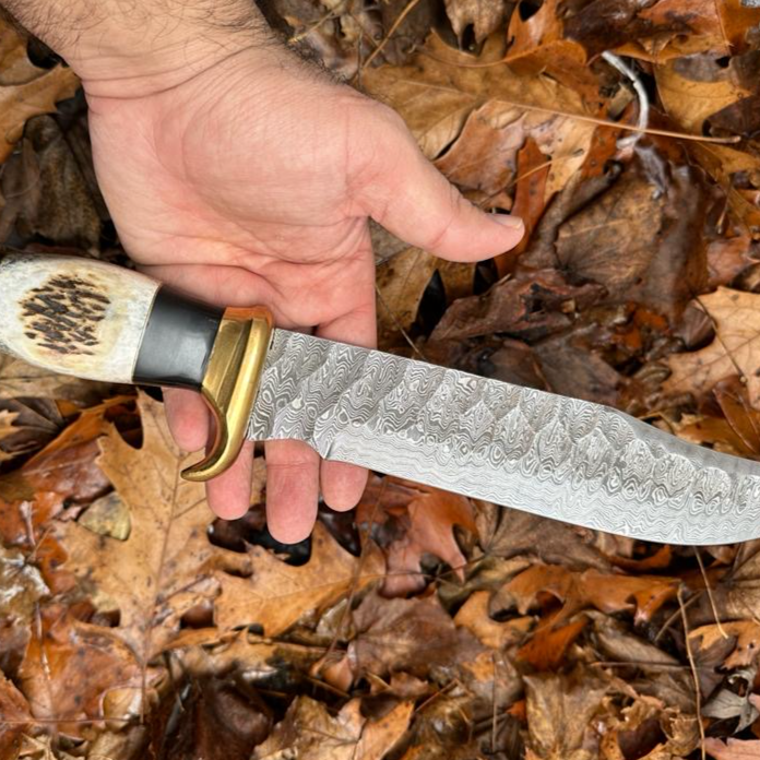 17" handcrafted damascus steel outdoor bowie knife with stag crown & bull horn handle