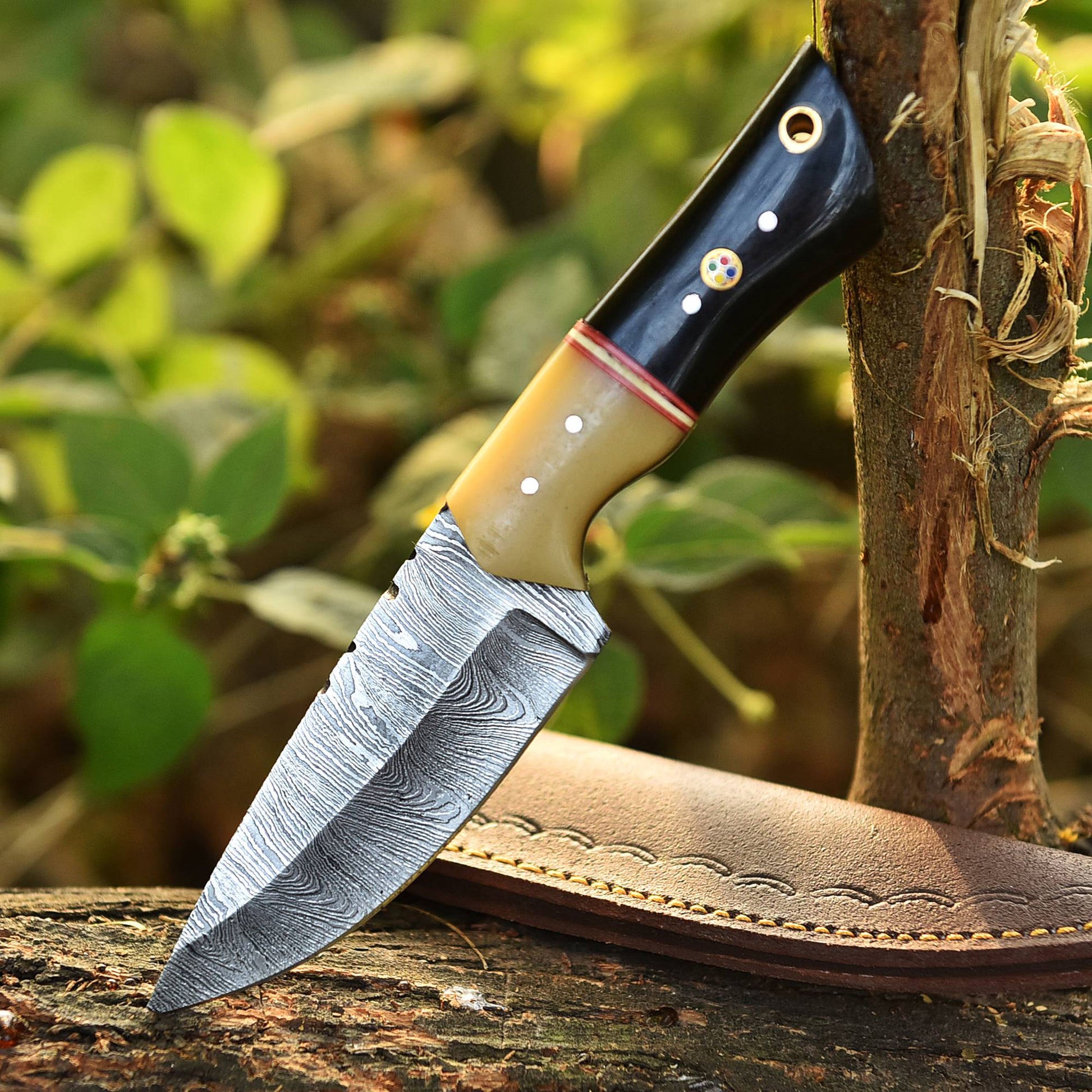 Custom Handmade Damascus Steel Skinner Knife – Resin Camel Bone Handle with Leather Sheath