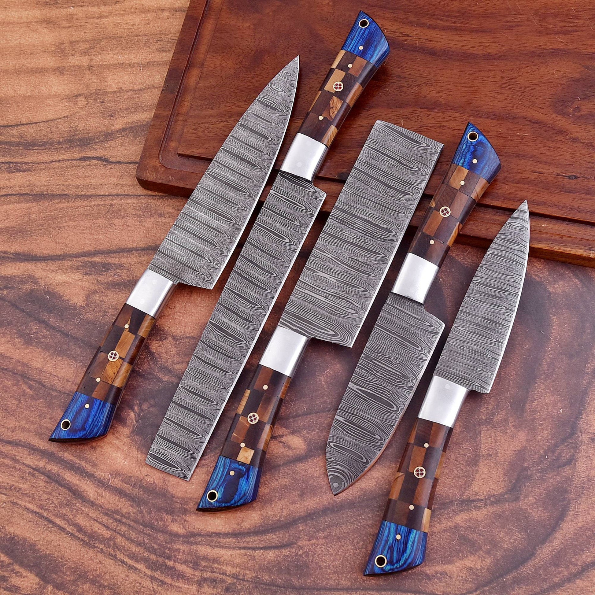 Our exquisite 5-Piece Damascus Steel Chef Knife Set is the perfect addition to any kitchen. Each knife is meticulously crafted from Damascus steel, resulting in a robust, sharp, and long-lasting blade. The full tang design and triple-riveted natural wood handles ensure optimal balance and control. The captivating swirling patterns on the blade add a touch of sophistication and make each knife a one-of-a-kind masterpiece. Whether you are a professional chef or a home cook, these knives are guaranteed to become a staple in your kitchen.