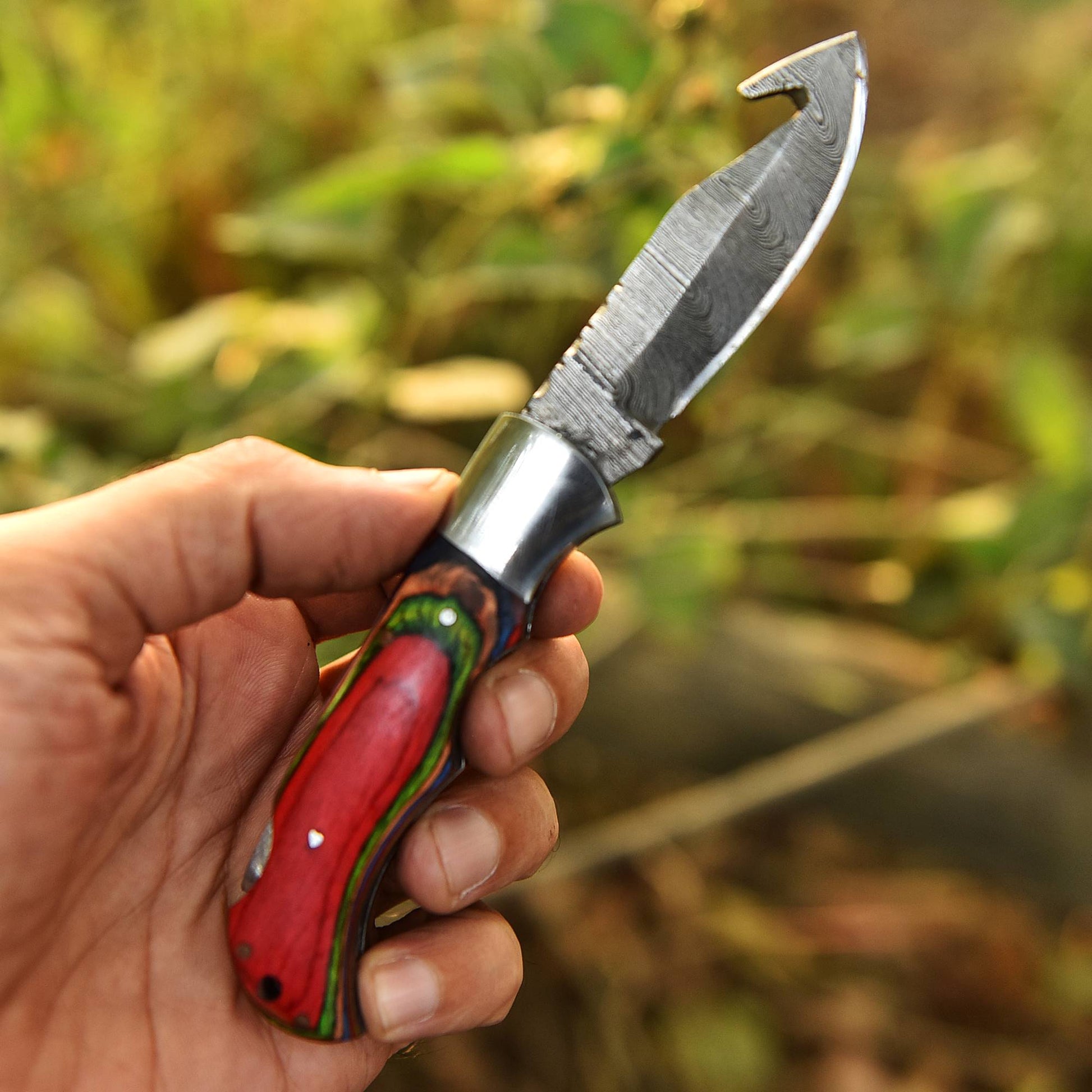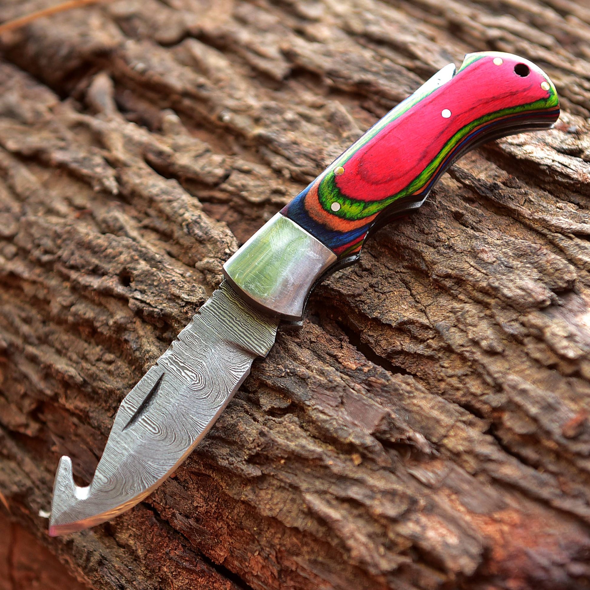 High Grade Hand Forged Folding Knife with Red Stained Wood Stainless Steel Clips.