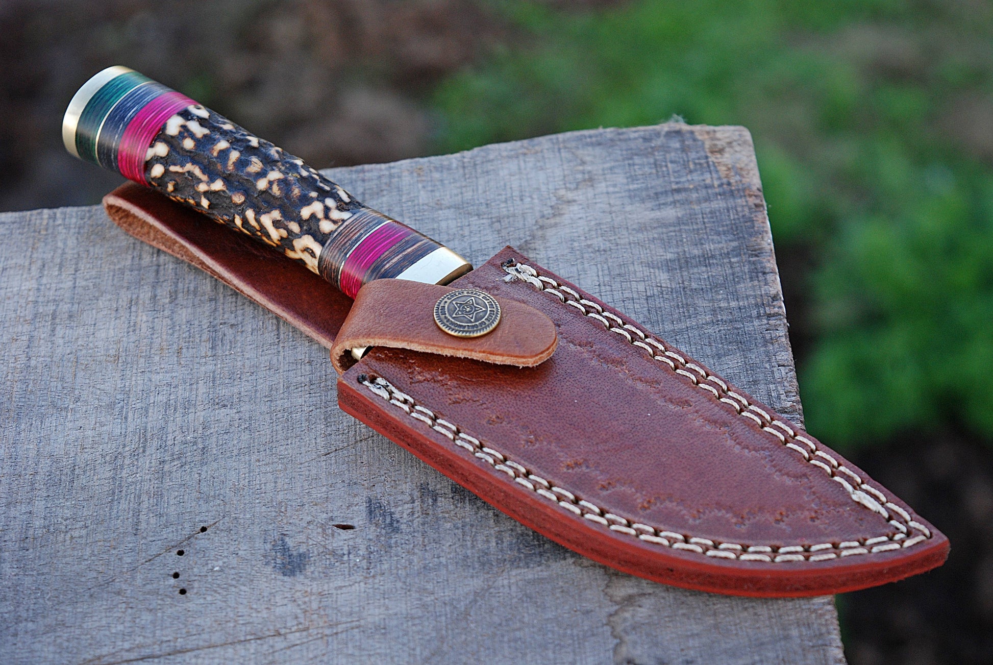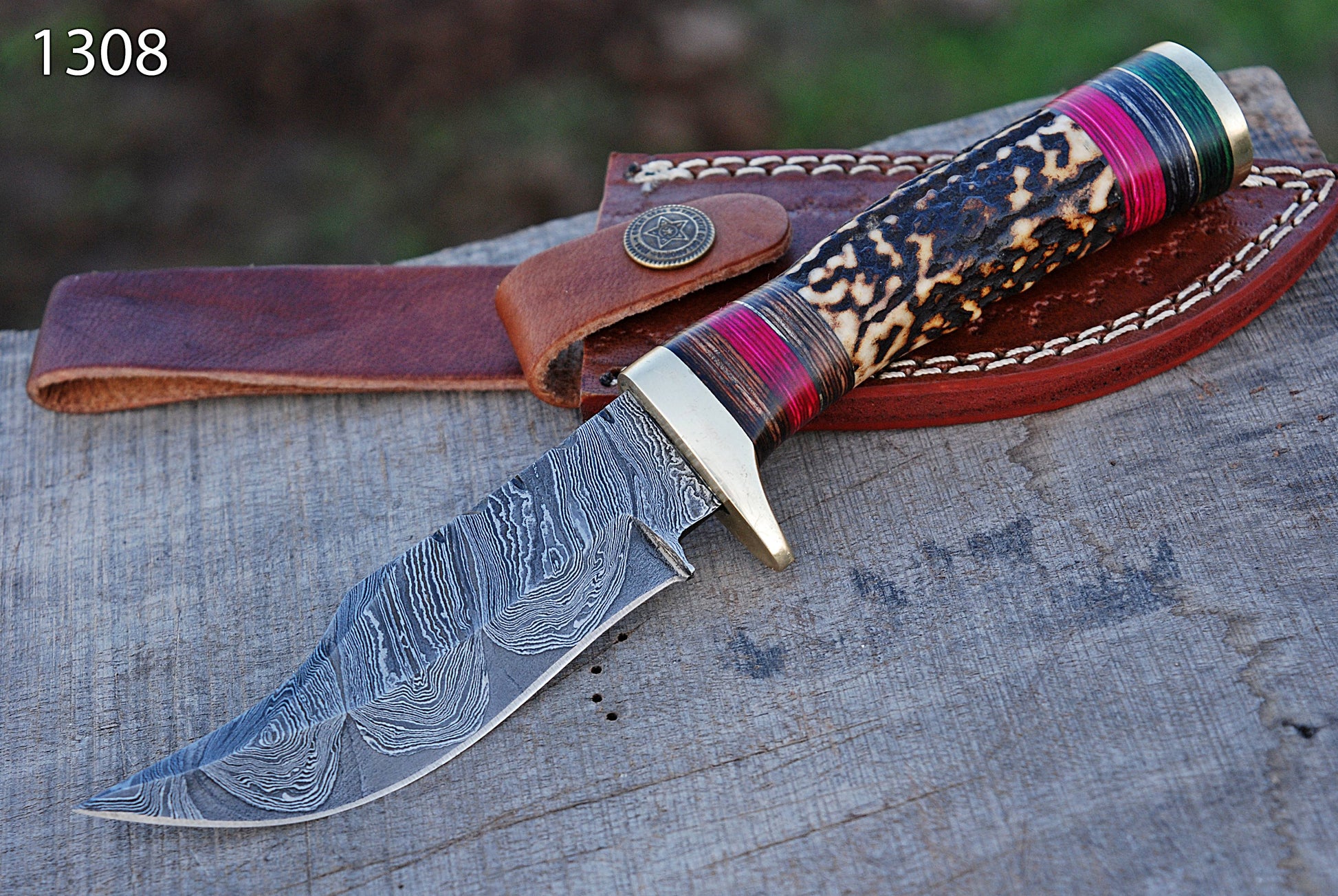Handmade damascus steel hunting knife original stag handle & brass guard with leather sheath