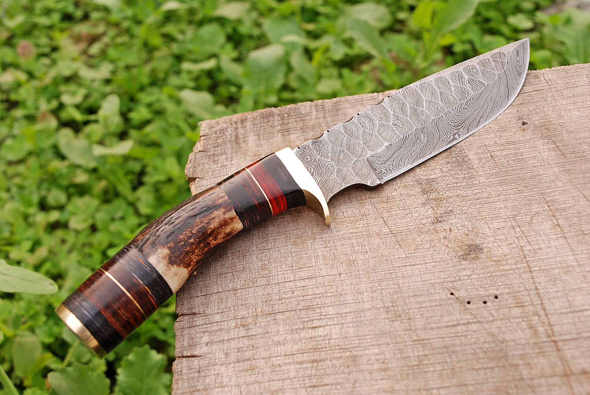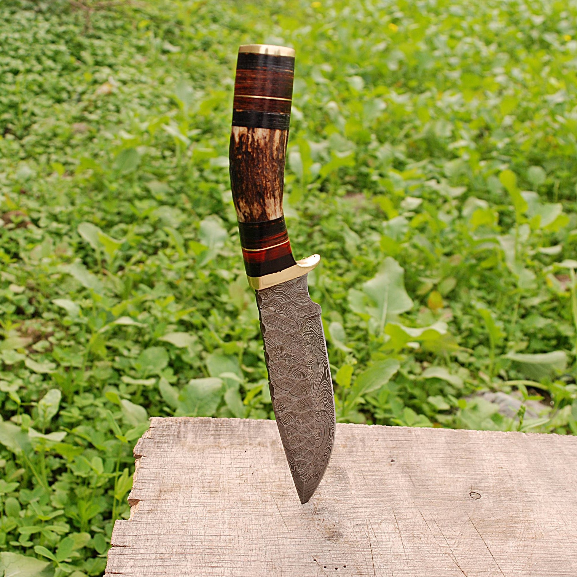 Handmade forged damascus steel kitchen utility knife outdoor camping with deer stag antler handle and leather sheath